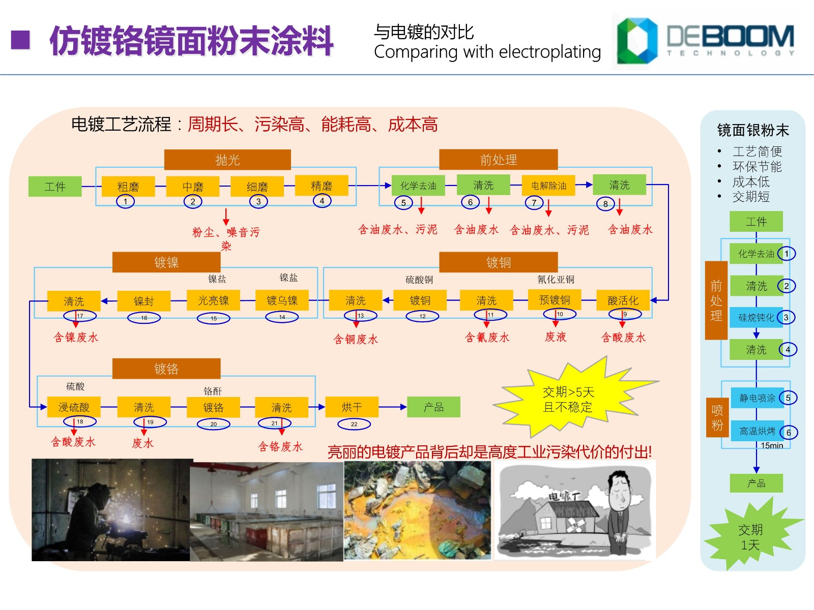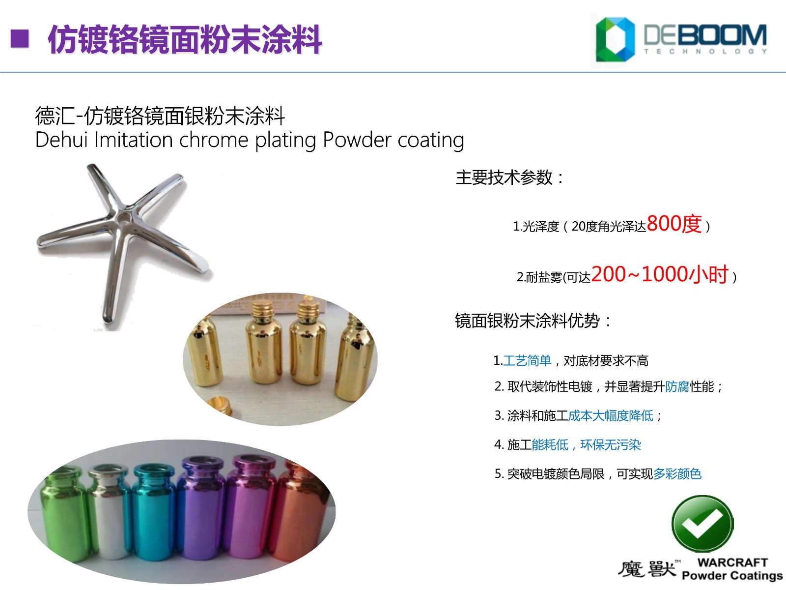 德匯-仿鍍鉻鏡面銀粉末涂料優(yōu)勢:1.工藝簡單,對底材要求不高2. 取代裝飾性電鍍,并顯著提升防腐性能3. 涂料和施工成本大幅度降低4. 施工能耗低,環(huán)保無污染5. 突破電鍍顏色局限,可實現(xiàn)多彩顏色